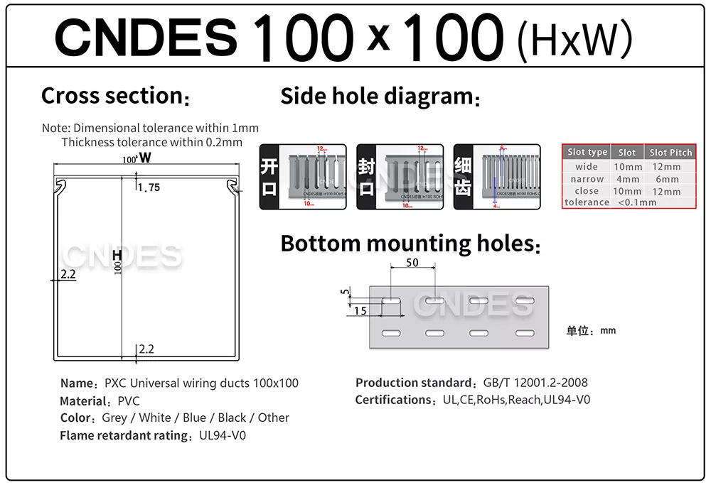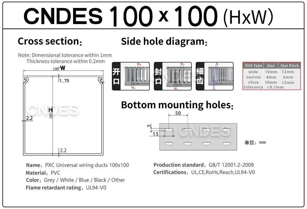 Βελτιστοποιήστε τα έργα καλωδίωσης με τους προσαρμοσμένους αγωγούς διαχείρισης καλωδίων 100×100. Ως κορυφαίος κατασκευαστής και προμηθευτής δίσκου καλωδίων PVC στην Κίνα, η CNDES παρέχει αξιόπιστες, υψηλής ακρίβειας και προσαρμόσιμες λύσεις για όλες τις ανάγκες διαχείρισης καλωδίων σας. Διαθέτουμε όλες τις προδιαγραφές συρμάτινων αγωγών (δίσκοι καλωδίων). Εάν χρειάζεστε άλλες προδιαγραφές, μη διστάσετε να επικοινωνήσετε μαζί μας!