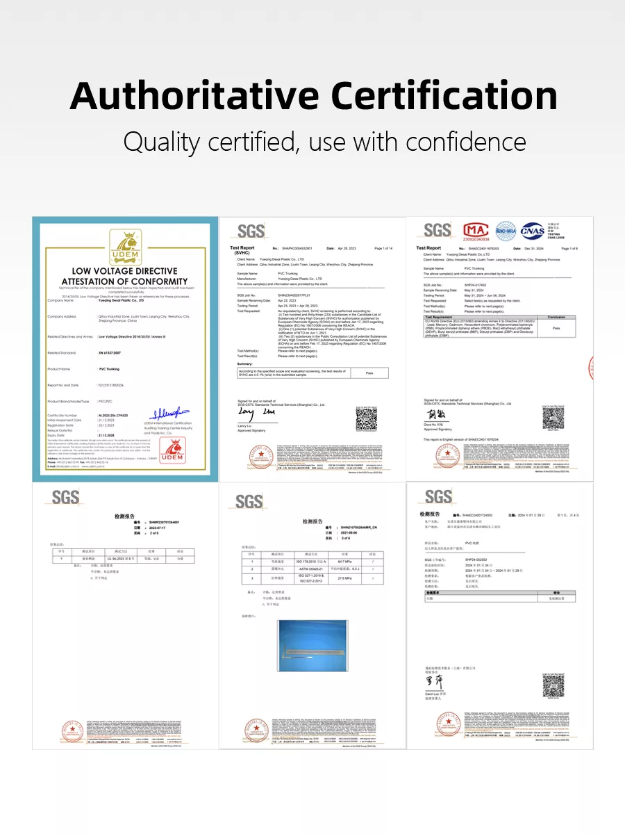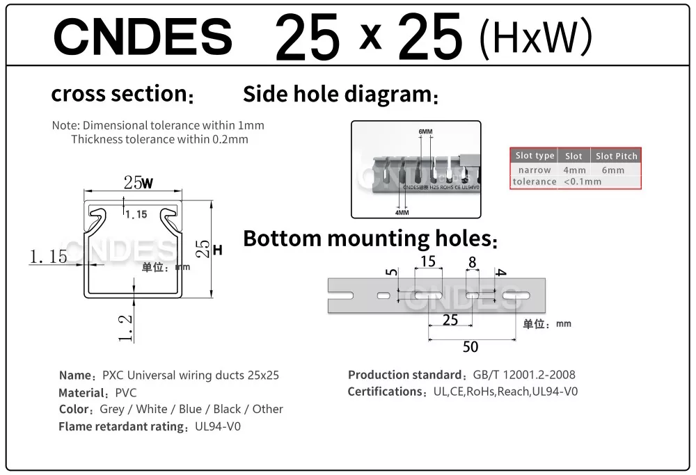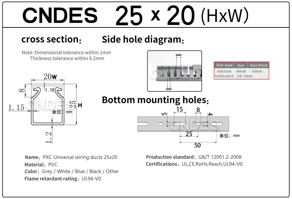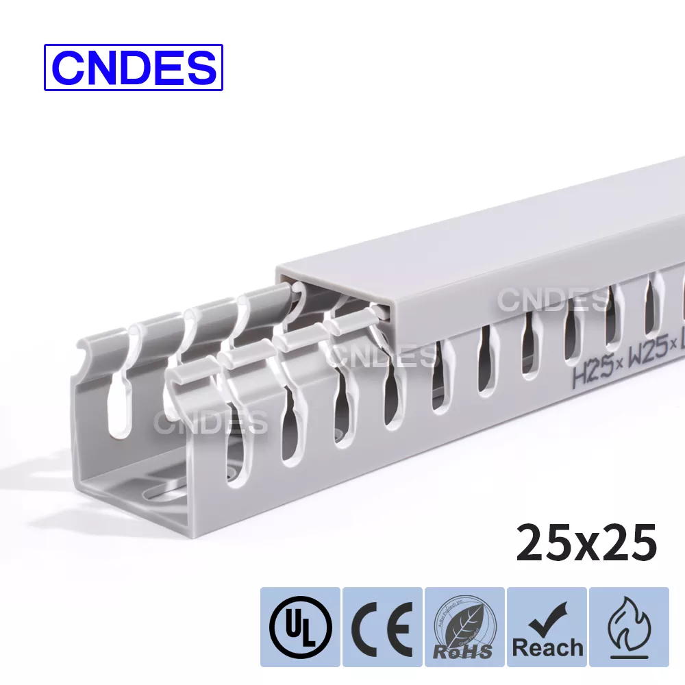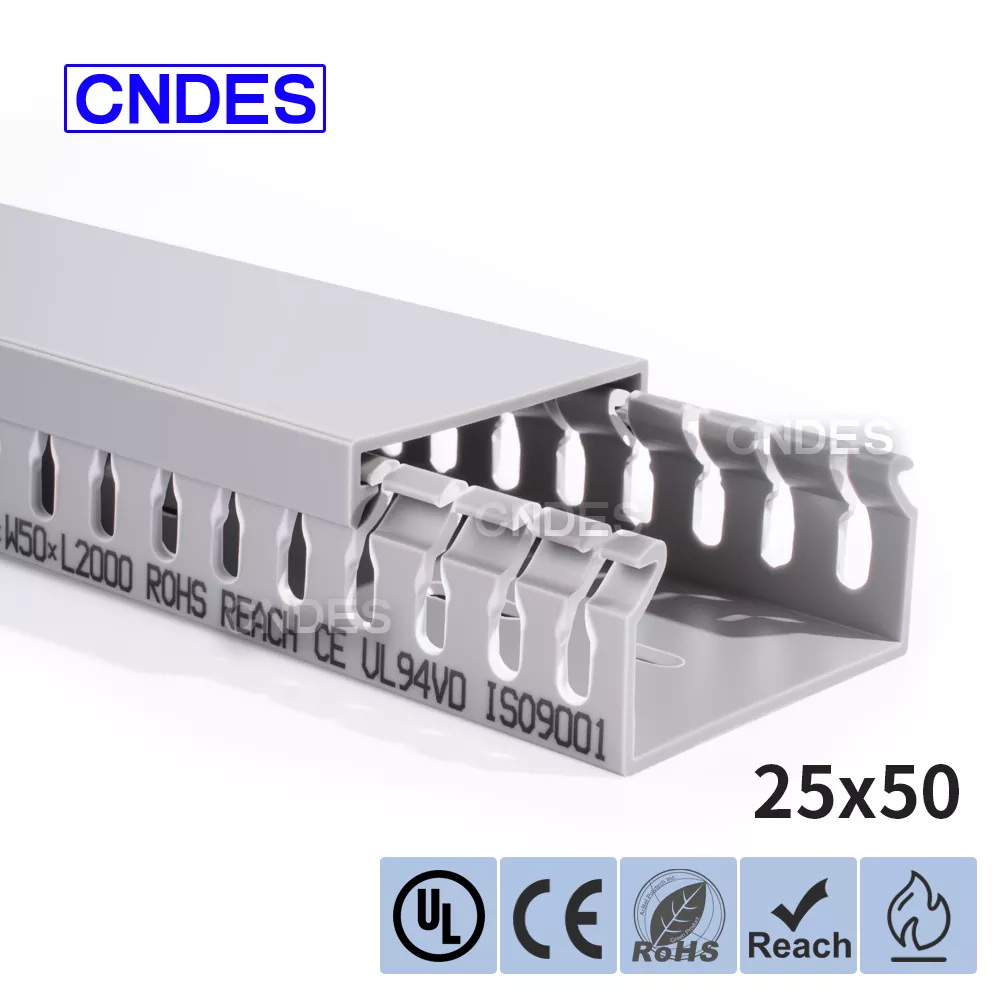 Μέσω του ανεξάρτητου ανεπτυγμένου εξοπλισμού σφράγισης υψηλής ακρίβειας, σε συνδυασμό με μια μοναδική τμηματοποιημένη διαδικασία αυτόματης κοπής, η CNDES μπορεί να παράγει ευέλικτα προϊόντα πολλαπλών προδιαγραφών, συμπεριλαμβανομένων αγωγών πίνακα ελέγχου με σχισμή PVC ύψους 25 χιλιοστών υψηλής απόδοσης, που καλύπτουν τις διαφορετικές ανάγκες των πελατών σε πίνακες ελέγχου και ηλεκτρικά συστήματα.