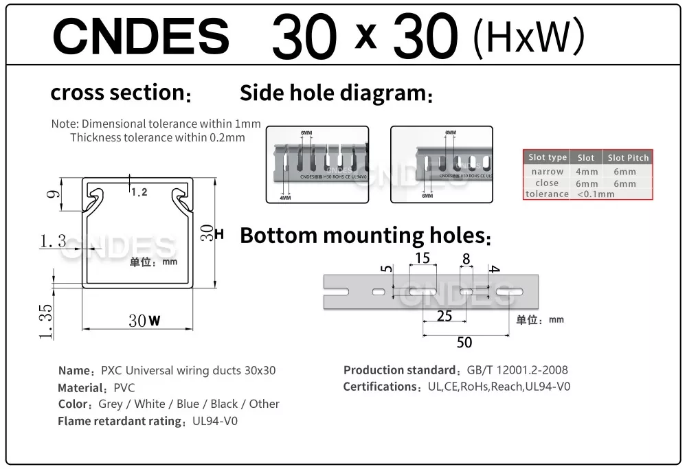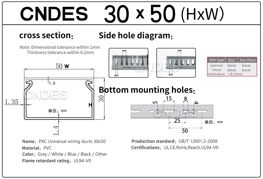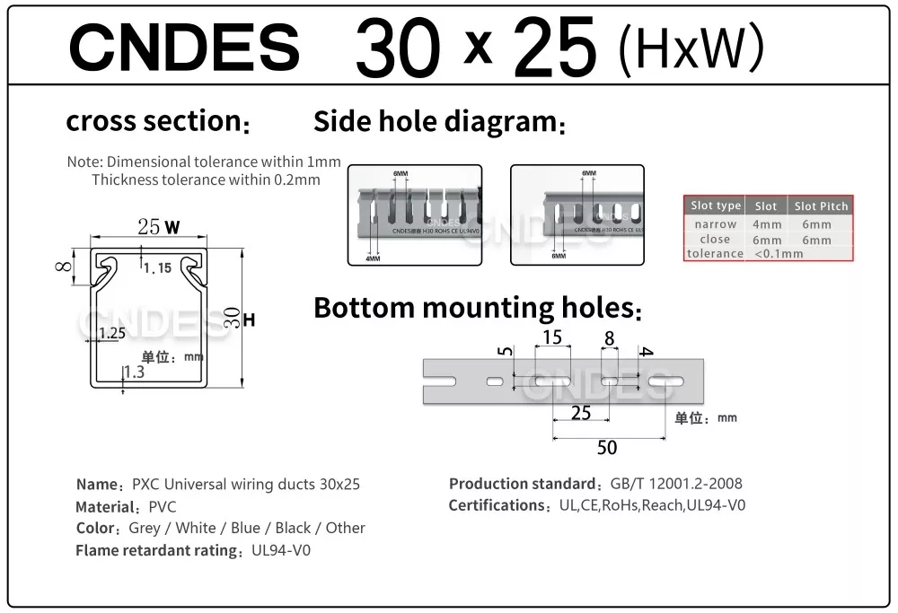 Περιλαμβάνει πληροφορίες όπως το πάχος, οι διαστάσεις και η διάτρηση του ποιοτικού αγωγού διαχείρισης καλωδίων PVC με σχισμή ύψους 30 mm.