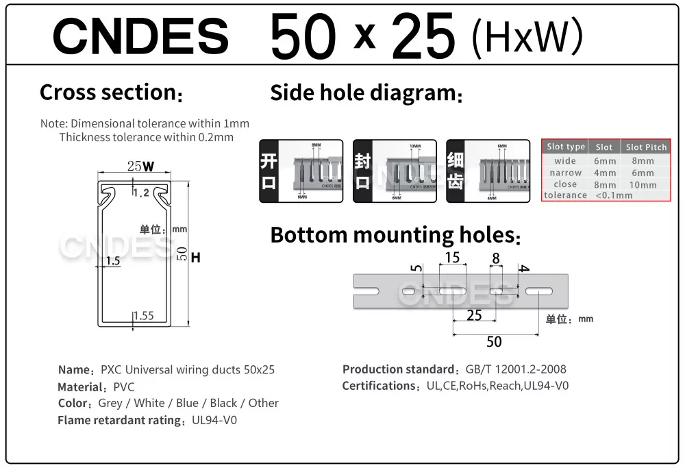 Κατασκευασμένο από υψηλής ποιότητας πρώτες ύλες PVC, φιλικό προς το περιβάλλον, επιβραδυντικό της φλόγας και με φυσικές ιδιότητες υψηλής αντοχής. Μπορείτε να είστε σίγουροι ότι αγοράζετε αγωγό ηλεκτρικού ντουλαπιού PVC με αυλακώσεις CNDES από το εργοστάσιό μας.