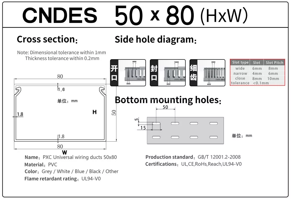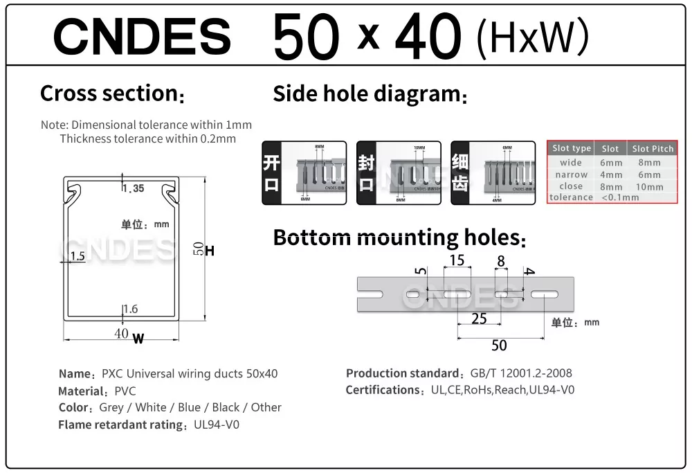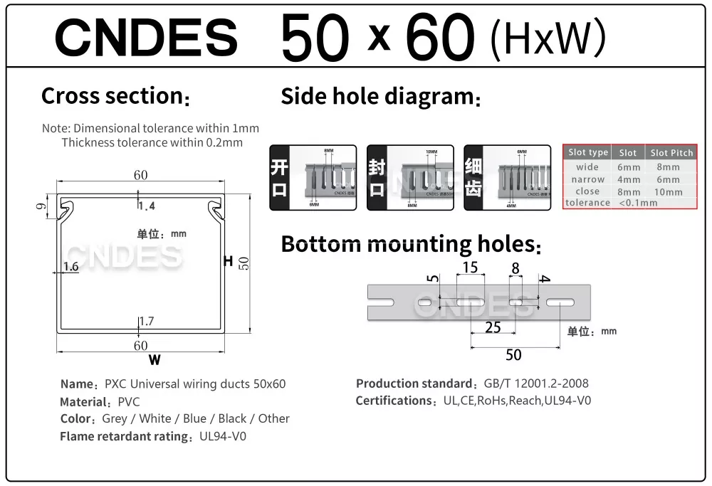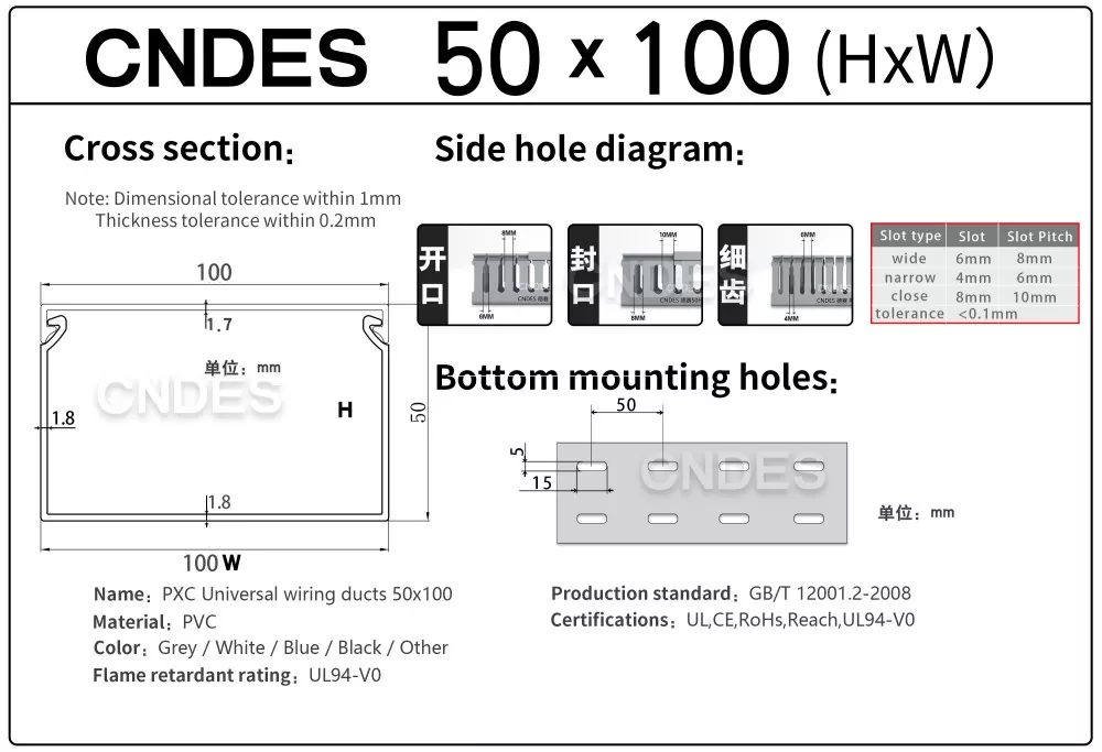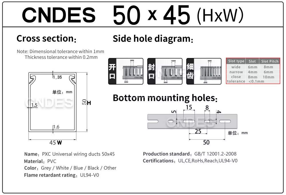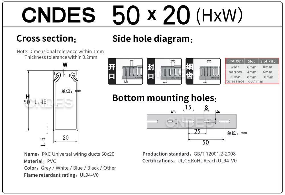 Η CNDES είναι κατασκευαστής και προμηθευτής που ειδικεύεται στην παροχή αγωγού καλωδίωσης πάνελ PVC με αυλακώσεις. Εδώ θα παρουσιάσουμε τον κορμό καλωδίωσης ύψους 50 mm, συμπεριλαμβανομένων των ακόλουθων προδιαγραφών:50*20,50*25,50*30,50*35,50*40,50*45,50*50,50*55,50*60,50*80,50*100.