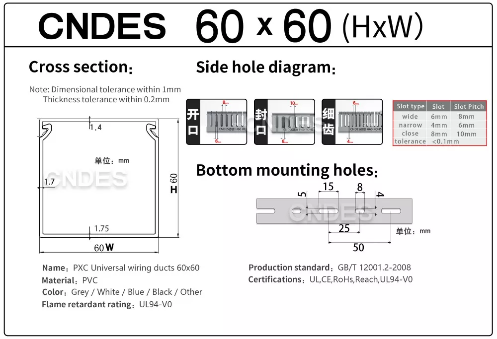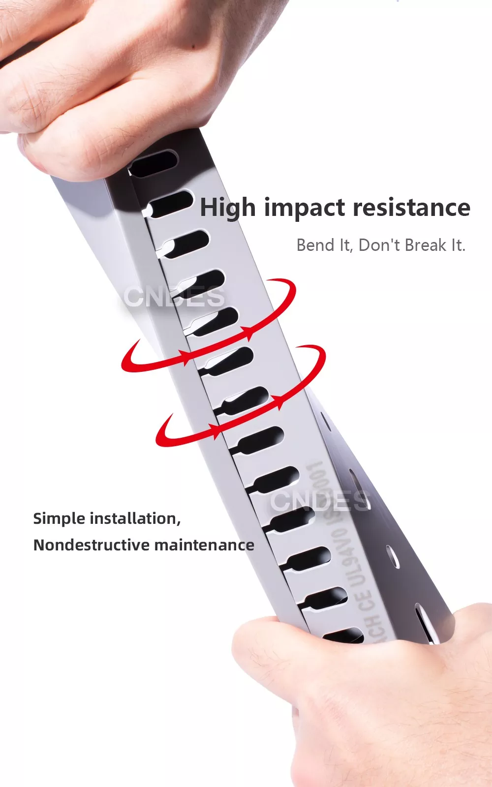 Ο αγωγός καλωδίου του ντουλαπιού ελέγχου της CNDES είναι κατασκευασμένος από ιδιόκτητη φόρμουλα PVC. Ο αγωγός ντουλαπιού ελέγχου PVC με σχισμή είναι φιλικός προς το περιβάλλον, επιβραδυντικός στη φλόγα και ανθεκτικός στην κρούση και μπορεί να αντέξει την επαναλαμβανόμενη κάμψη 180° χωρίς να σπάσει.